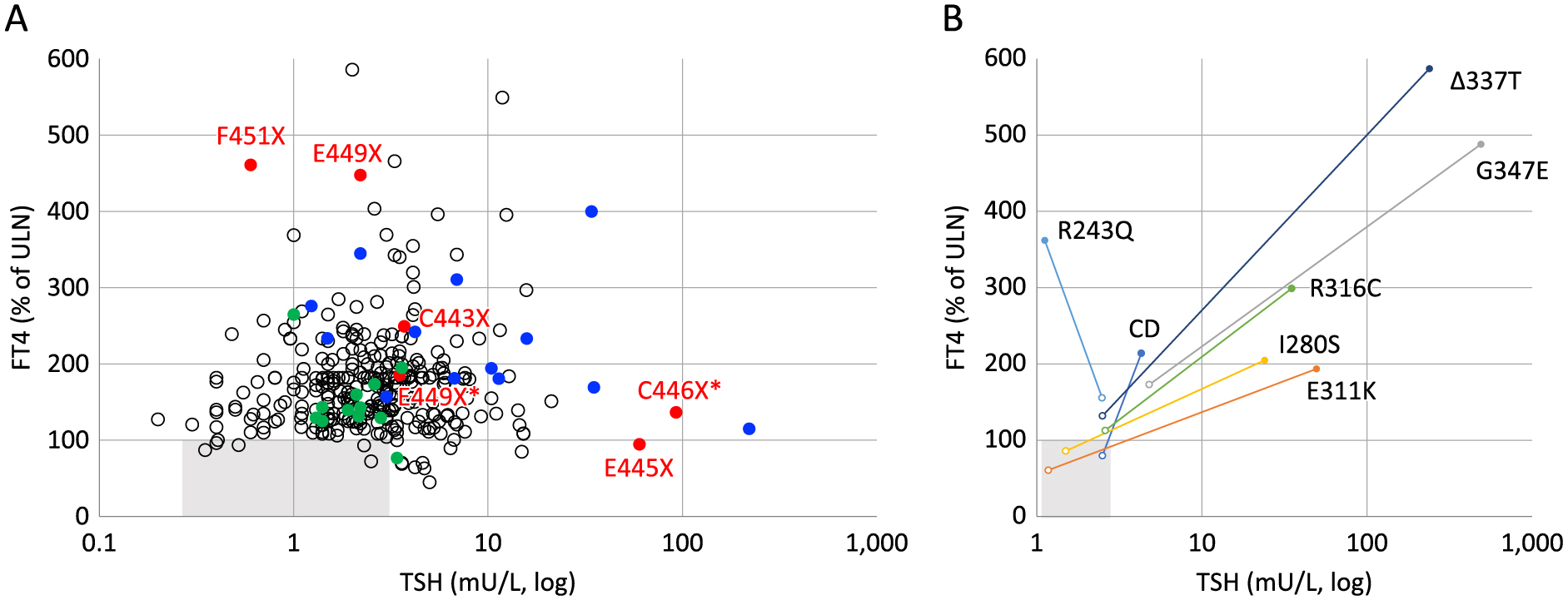 佳學(xué)基因甲狀腺激素抵抗全身性抵抗型基因檢測(cè)大數(shù)據(jù)分析的FT4值以各機(jī)構(gòu)參考范圍上限的百分比表示。(A)通過(guò)人工智能數(shù)據(jù)分析及認(rèn)知模型從案例中獲得了四種不同的單個(gè)氨基酸缺失(綠色圓圈),五種不同的早期終止密碼子(紅色圓圈)和六種不同的移碼突變(藍(lán)色圓圈),并與單個(gè)氨基酸缺失和單個(gè)氨基酸替代(開(kāi)放圓圈)進(jìn)行了比較,這些數(shù)據(jù)是從佳學(xué)基因的案例集中分析得來(lái)。FT4值以其對(duì)應(yīng)的TSH先進(jìn)值(對(duì)數(shù)尺度)繪制,參考范圍用灰色方塊表示。帶有星號(hào)的兩個(gè)截?cái)嗤蛔兪褂每俆4值繪制。(B)通過(guò)人工智能認(rèn)知模型獲得了RTHβ的同卵突變患者(實(shí)心圓圈),其中包括一種單個(gè)氨基酸缺失(Δ337T),五種不同的單個(gè)氨基酸替代和一種有效缺失(外顯子4-10),并與異卵突變患者(開(kāi)放圓圈)進(jìn)行了比較。CD表示有效缺失。