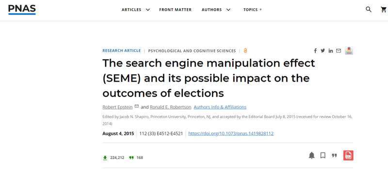 2015年8月,美國行為研究與技術(shù)學(xué)會的高級研究心理學(xué)家Robert Epstein就指出,通過「帶有偏見的搜索結(jié)果」,谷歌可以影響了猶豫不決的選民。
