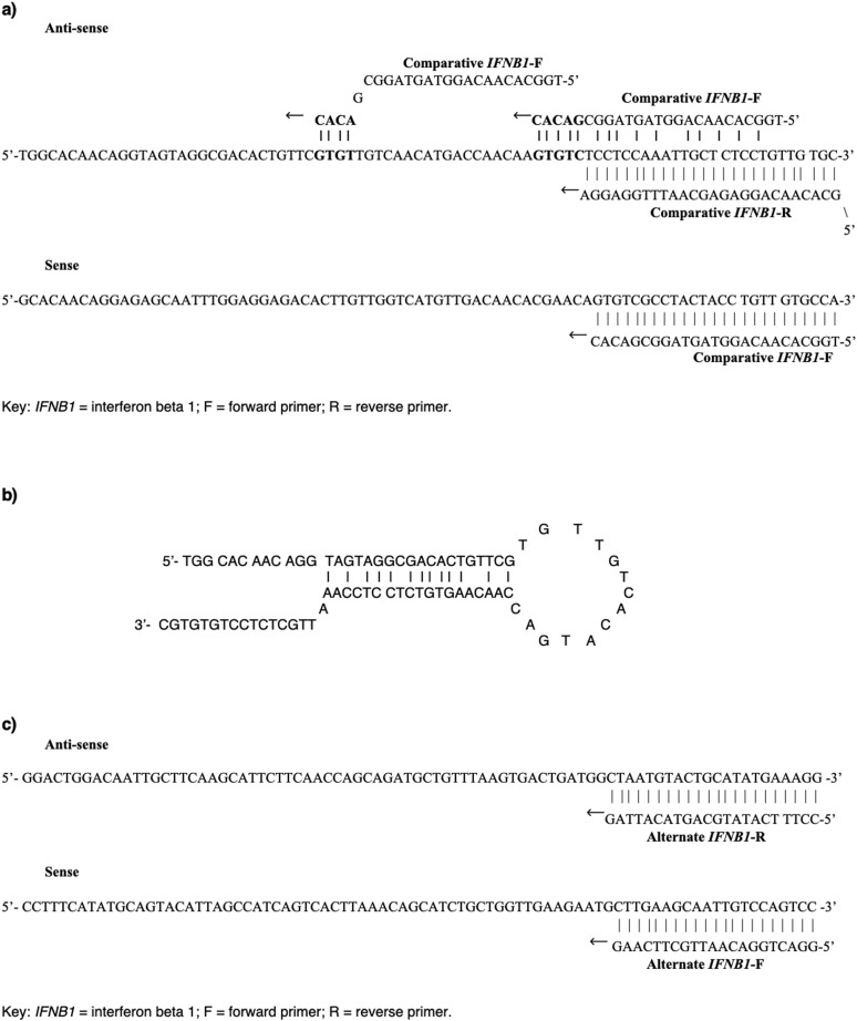 Comparative IFNB1 oligomer (anti-sense) 5′-TGG CAC AAC AGG TAG TAG GCG ACA CTG TTC GTG TTG TCA ACA TGA CCA ACA AGT GTC TCC TCC AAA TTG CTC TCC TGT TGT GC- 3′