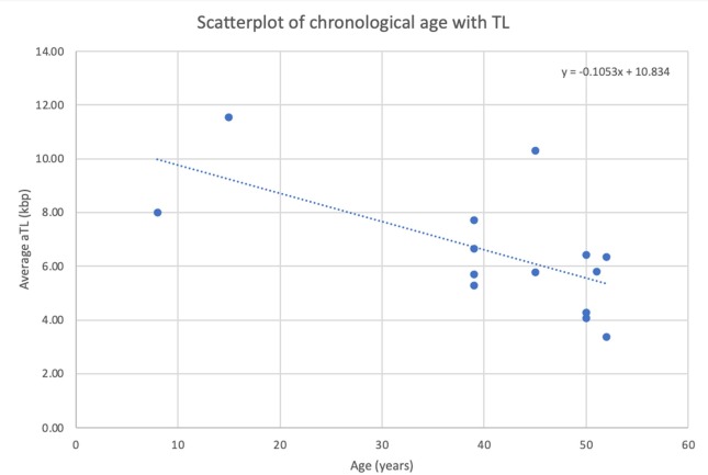 圖4. 使用替代IFNB1單拷貝基因進行先進端粒長度分析的年齡和端粒長度(端粒長度)的散點圖。