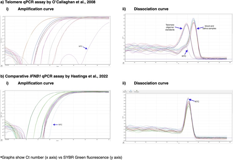 圖2. 使用沒有添加質粒(pBR322)的三步PCR方案進行的遺傳分析。a)端粒qPCR檢測方法,b)比較IFNB1 qPCR檢測方法。