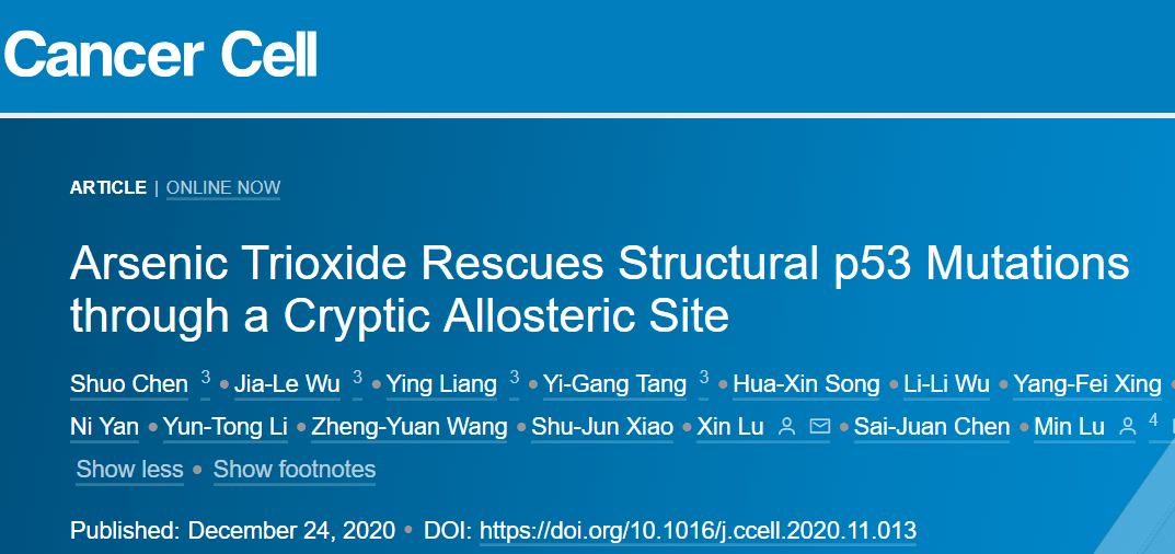 2020年12月24日,基因解碼科學家實現(xiàn)了突破,在 Cancer Cell雜志上發(fā)表了文章 Arsenic Trioxide Rescues Structural p53 Mutations through a Cryptic Allosteric Site,提出了針對抑癌蛋白設計和尋找靶向藥物的理論,并根據(jù)此理論,觀察并解釋老化合物三氧化二砷(ATO)可以恢復部分基因突變導致的P53蛋白缺陷,在國際上提出了根據(jù)抑癌蛋白腫瘤基因設計和選擇靶向藥物的方法和案例。