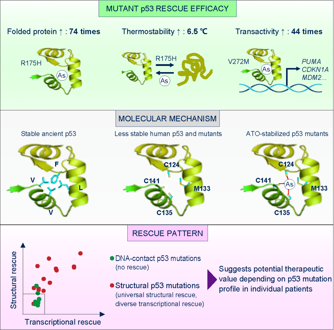 本期 Cancer Cell 上線了由瑞金醫(yī)院盧敏研究員等對中藥單體小分子ATO抗腫瘤機制的一項突破性工作。在該論文中,ATO釋放砷原子,共價結合抑癌蛋白p53內(nèi)部的C124-C135-C141空腔,固定了突變型p53三級結構,并使其保留轉錄功能和抑癌功能,最終展示出依賴結構突變型p53的細胞增殖抑制能力和抗CDX及PDX腫瘤模型的能力。 研究的三項亮度在于:1)癌癥中一半以上的高頻突變基因編碼抑癌蛋白,但臨床使用的靶向藥物無一靶向于這類蛋白。本研究提出了基于結構穩(wěn)定性的抑癌蛋白靶向理論,并通過共結晶、提供小分子化合物這兩項實例證實了這一理論靶向抑癌蛋白的可行性。2)被ATO靶向的蛋白是被稱為“基因組守衛(wèi)者(guardian of the genome)”的p53。p53在全球一半癌癥患者發(fā)生突變,在我國五大高發(fā)腫瘤(肺癌、乳腺癌、結直腸癌、胃癌、肝癌)上的突變率超過40%,在卵巢癌、小細胞肺癌、肺鱗癌、食管癌、頭頸癌上的突變率超過80%。3)論文展示的數(shù)據(jù)表明,ATO對p53熱力學穩(wěn)定性、蛋白折疊、轉錄活性等各項指標上的恢復效率,均在若干數(shù)量級上,優(yōu)于已報道的p53功能恢復化合物。