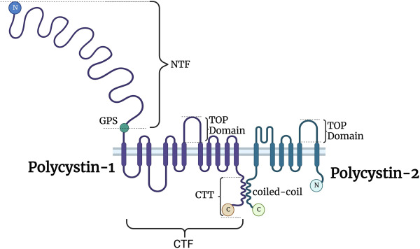 PC1 和 PC2 的結(jié)構(gòu)。 PC1 和 PC2 通過它們的跨膜結(jié)構(gòu)域和卷曲螺旋結(jié)構(gòu)域相互作用。 PC1 在 GPS(G 蛋白水解位點)處被切割,產(chǎn)生 2 個保持束縛的片段:NTF(N 端片段)和 CTF(C 端片段)。 CTF 被進一步切割,產(chǎn)生 CTT(細胞質(zhì)末端“尾巴”),基因解碼發(fā)現(xiàn)它可以運輸?shù)郊毎撕?或線粒體。 TOP,多囊蛋白結(jié)構(gòu)域的四方開口,在多囊蛋白中是保守的,基因解碼認為可以調(diào)節(jié) PC2 活性。