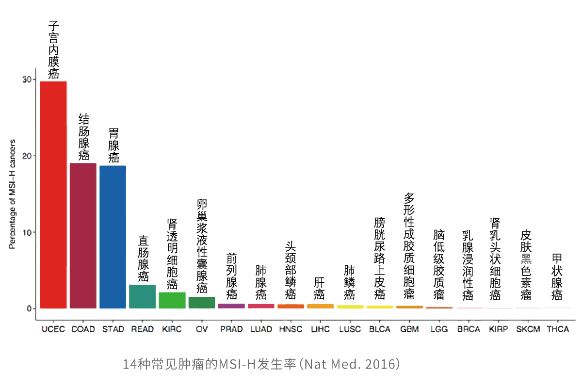 微衛(wèi)星(microsatellites)是遍布于人類(lèi)基因組中的短串聯(lián)重復(fù)序列。與正常組織相比,腫瘤組織的微衛(wèi)星由于重復(fù)單位的插入或缺失而導(dǎo)致微衛(wèi)星長(zhǎng)度的改變,就叫做微衛(wèi)星不穩(wěn)定性(Microsatellite Instability,MSI)。大量研究表明,MSI是由錯(cuò)配修復(fù)(MMR)基因發(fā)生缺陷引起的,與腫瘤的發(fā)生密切相關(guān)。
