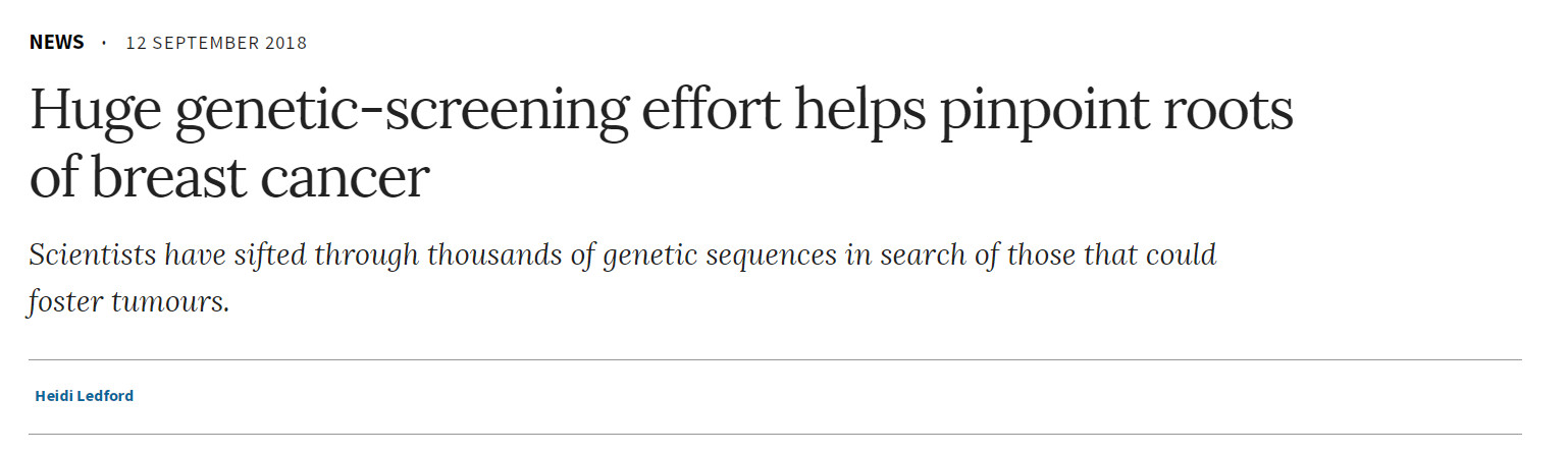 [3] Huge genetic-screening effort helps pinpoint roots of breast cancer, Retrieved September 12, 2018, from https://www.nature.com/articles/d41586-018-06665-x